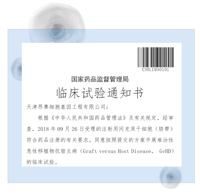 2025年11月3日, 天津昂賽細胞基因工程有限公司申報的注射用間充質(zhì)干細胞(臍帶)治療難治性急性移植物抗宿主?。╝GvHD)兒童患者的適應(yīng)癥獲得國家藥品監(jiān)督管理局臨床試驗?zāi)驹S可
